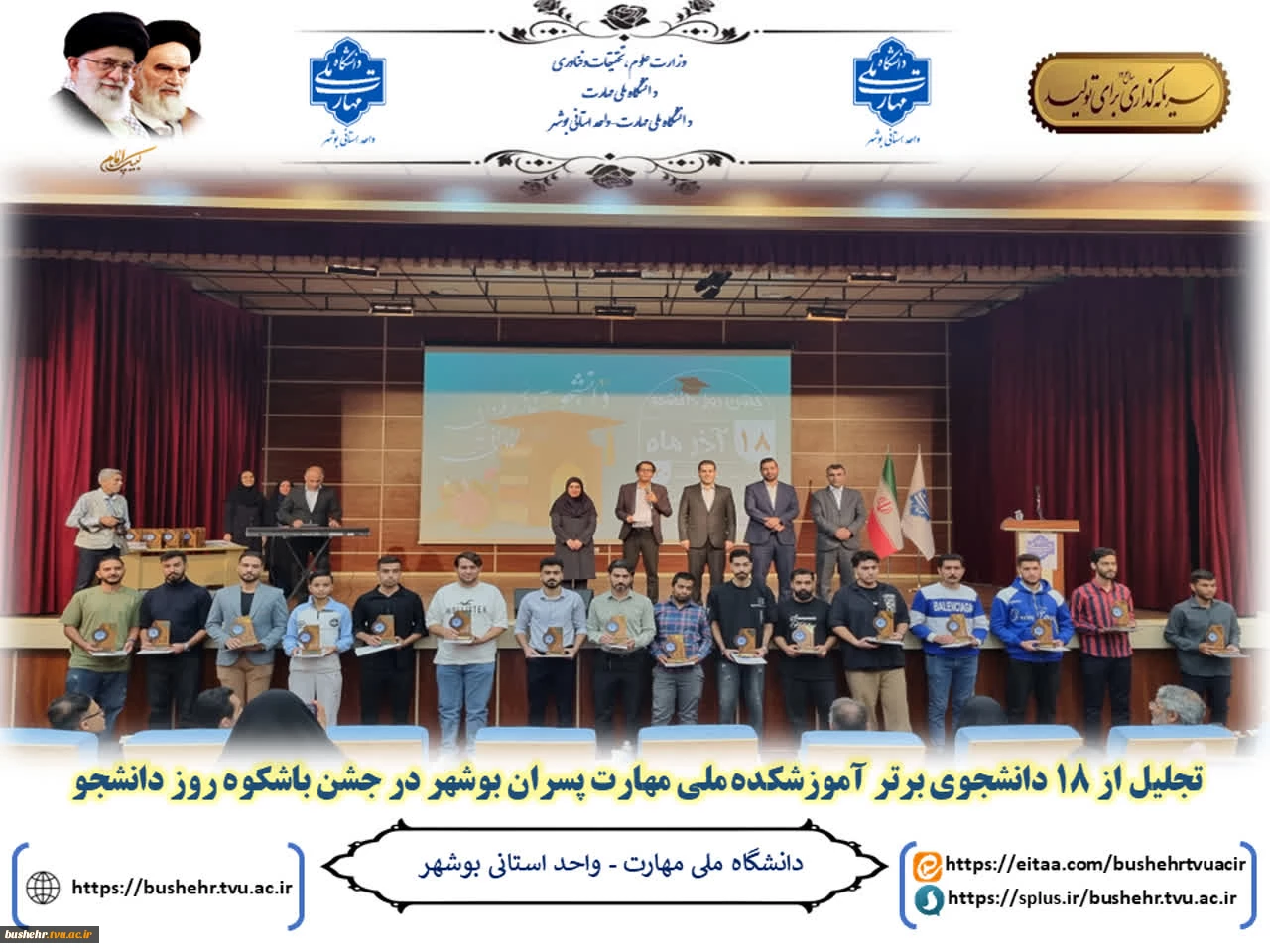 امتیاز دهید : تجلیل از 18 دانشجوی برتر آموزشکده ملی مهارت پسران بوشهر در جشن باشگوه روز دانشجو 2 جمعه 21 آذر 1404 ساعت 13:58