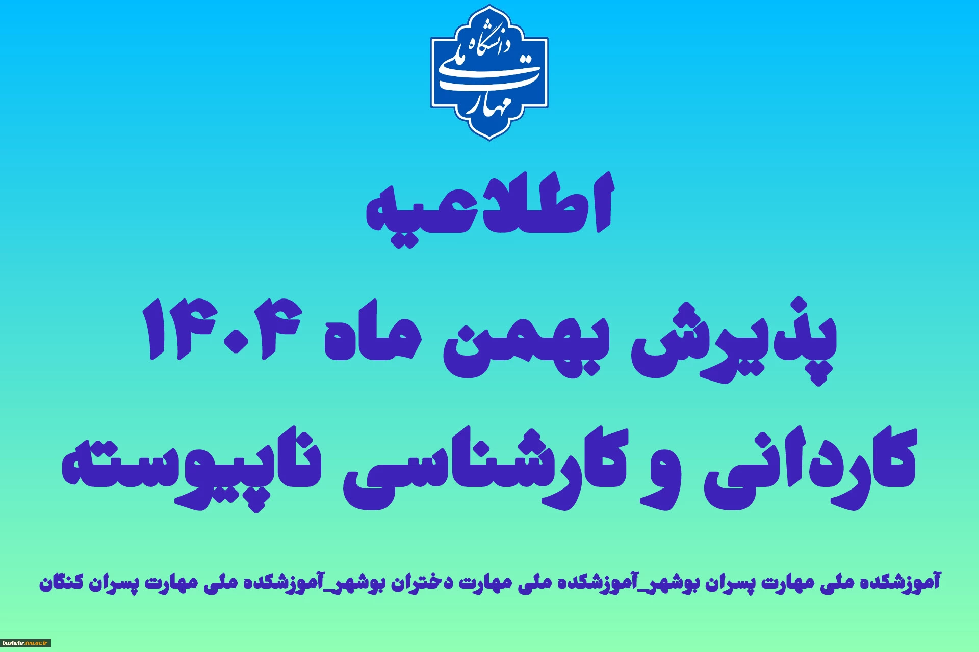 اطلاعیه اعلام تاریخ ثبتنام و انتخاب رشته در رشته های پذیرش دانشجو صرفاً براساس سوابق تحصیلی (بدون آزمون) مقاطع کاردانی و کارشناسی ناپیوسته بهمن ماه سال 1404 آموزشکده ملی مهارت پسران بوشهر_آموزشکده ملی مهارت دختران بوشهر_آموزشکده ملی مهارت پسران کنگان 2